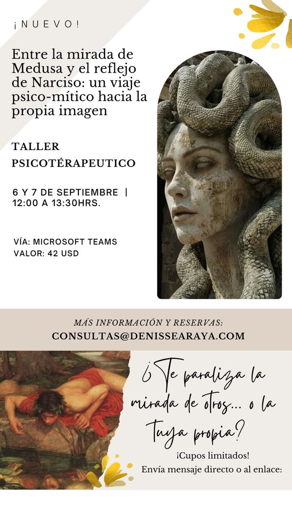 En este taller de 2 días exploraremos cómo la mirada de otros y la propia puede paralizarnos y generar ansiedad, vergüenza o inseguridad. A través de los mitos de Medusa y Narciso, realizaremos ejercicios prácticos y reflexiones que te ayudarán a identificar patrones que te limitan, encontrar formas más llevaderas de enfrentarlos y ganar claridad sobre tu vida y emociones.